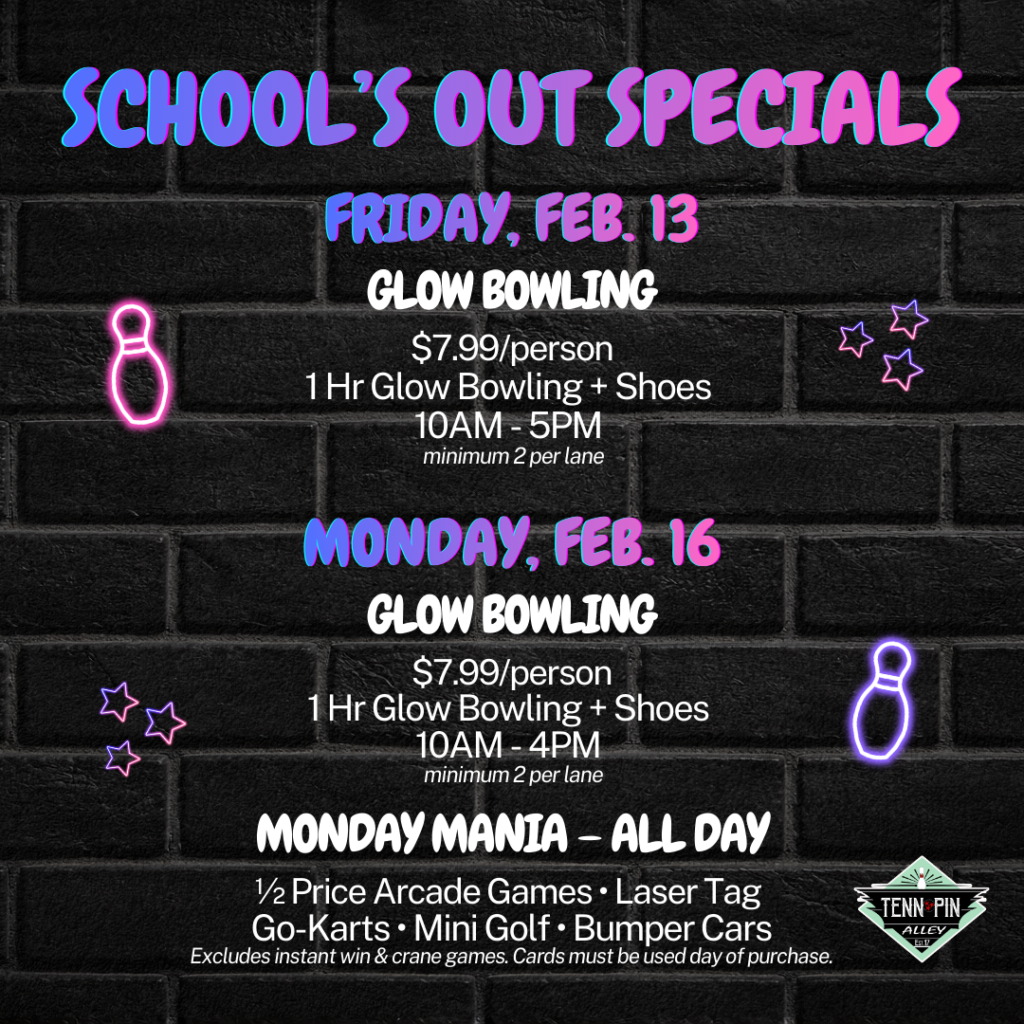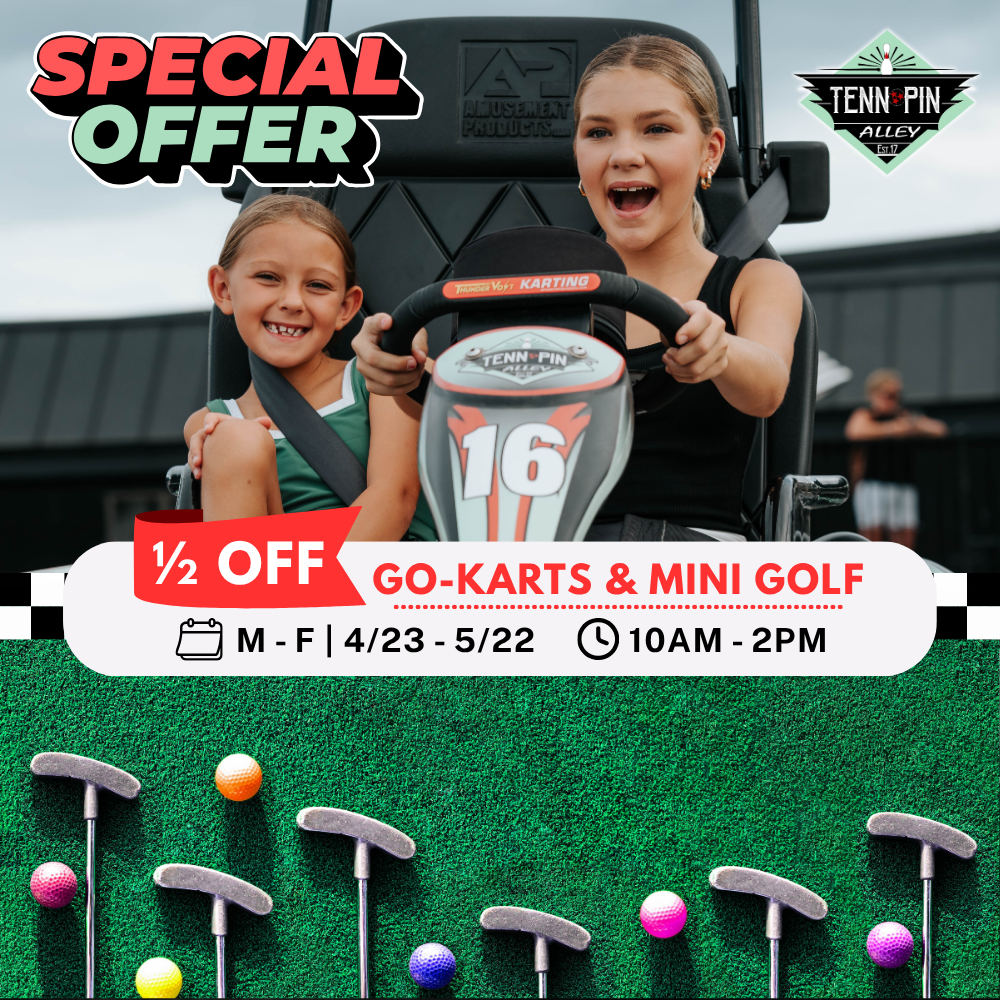 Tenn Pin Alley is the place to eat, play, and party with family, friends, co-workers, and groups of all sizes. Our attractions include 32 bowling lanes, a 60+ game arcade, prize redemption store, bumper cars, laser tag, go-karts, and mini golf, offering hours of fun for every age.